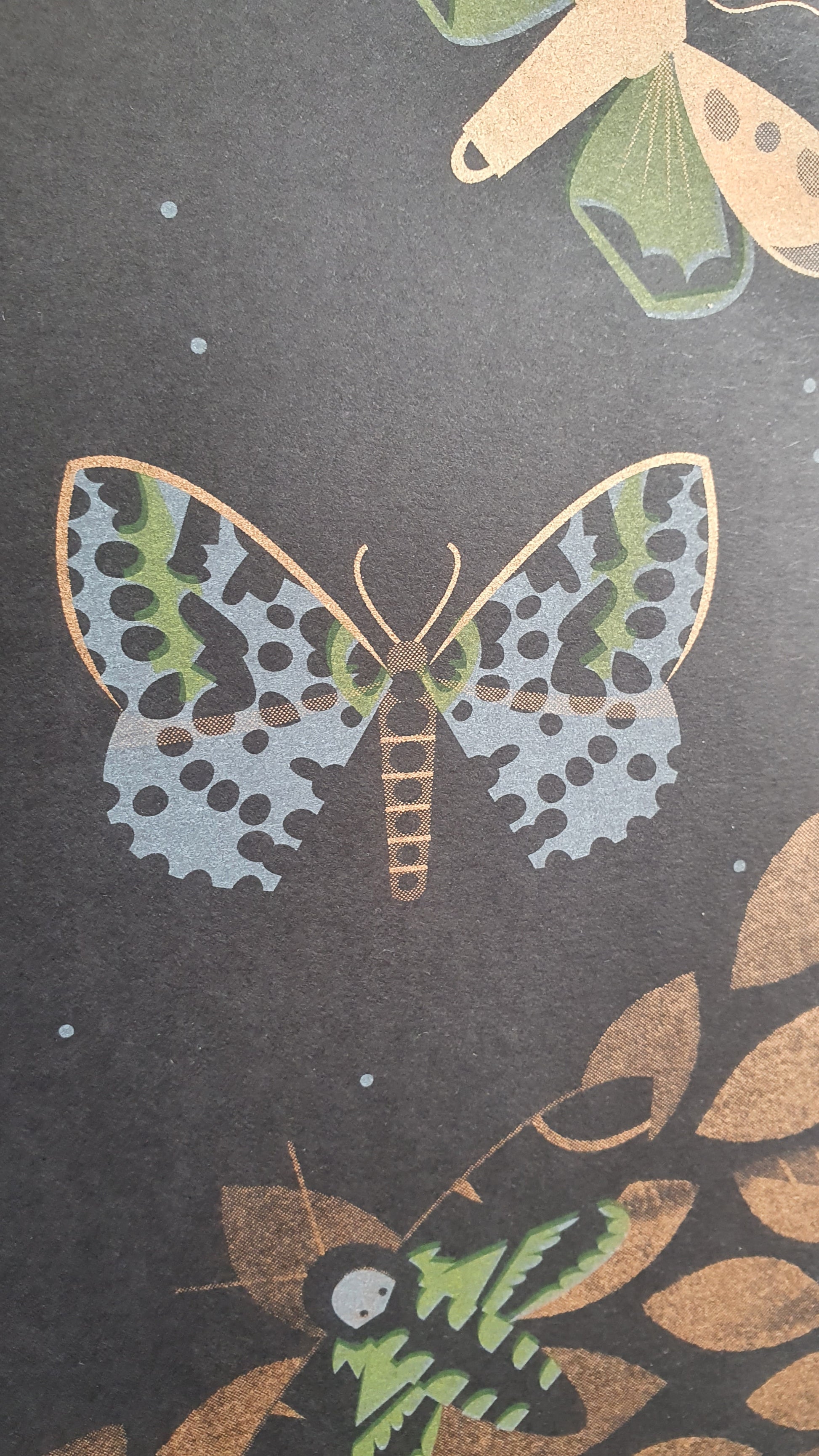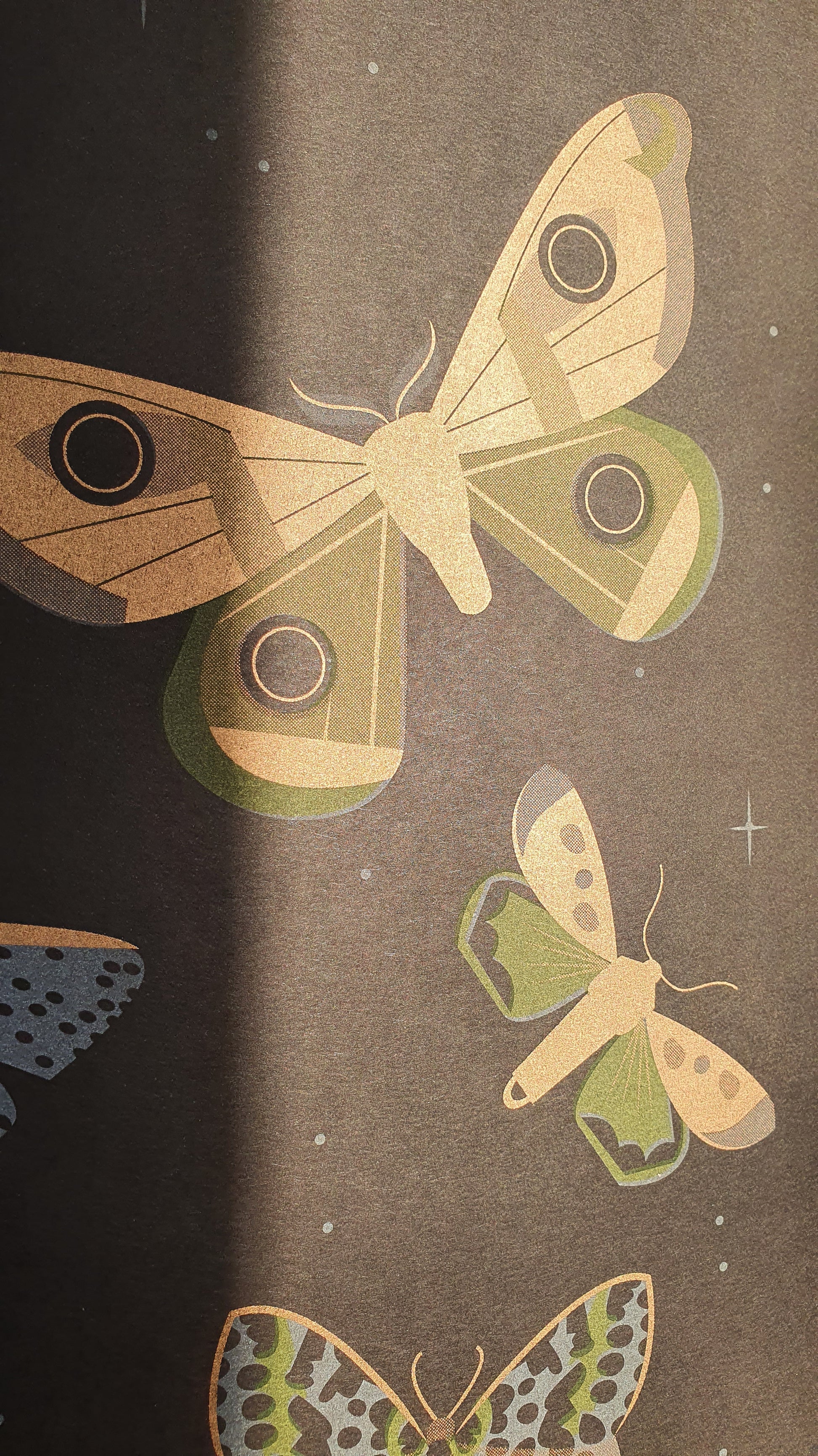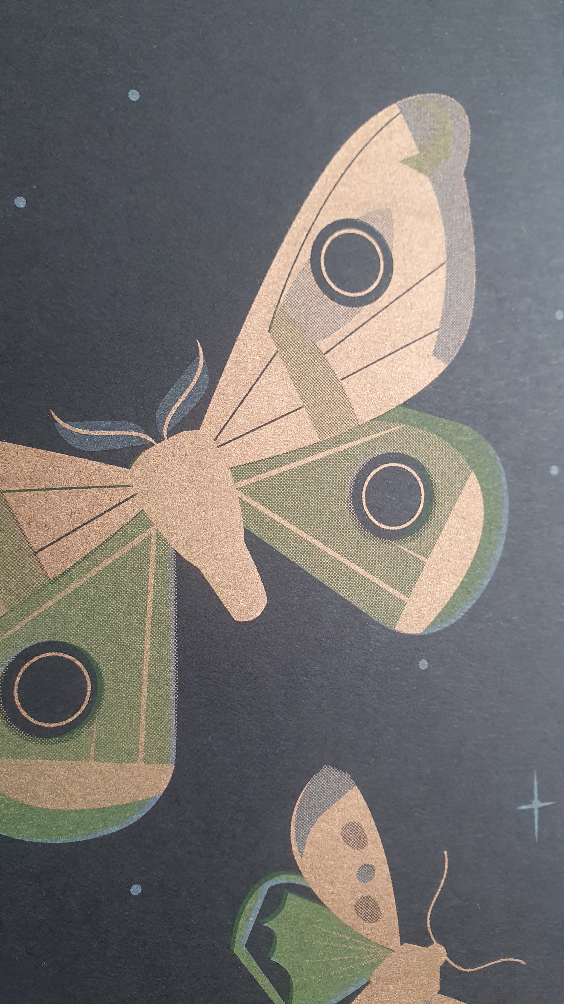 A beautiful print featuring graceful moths flying at night in a starry sky.