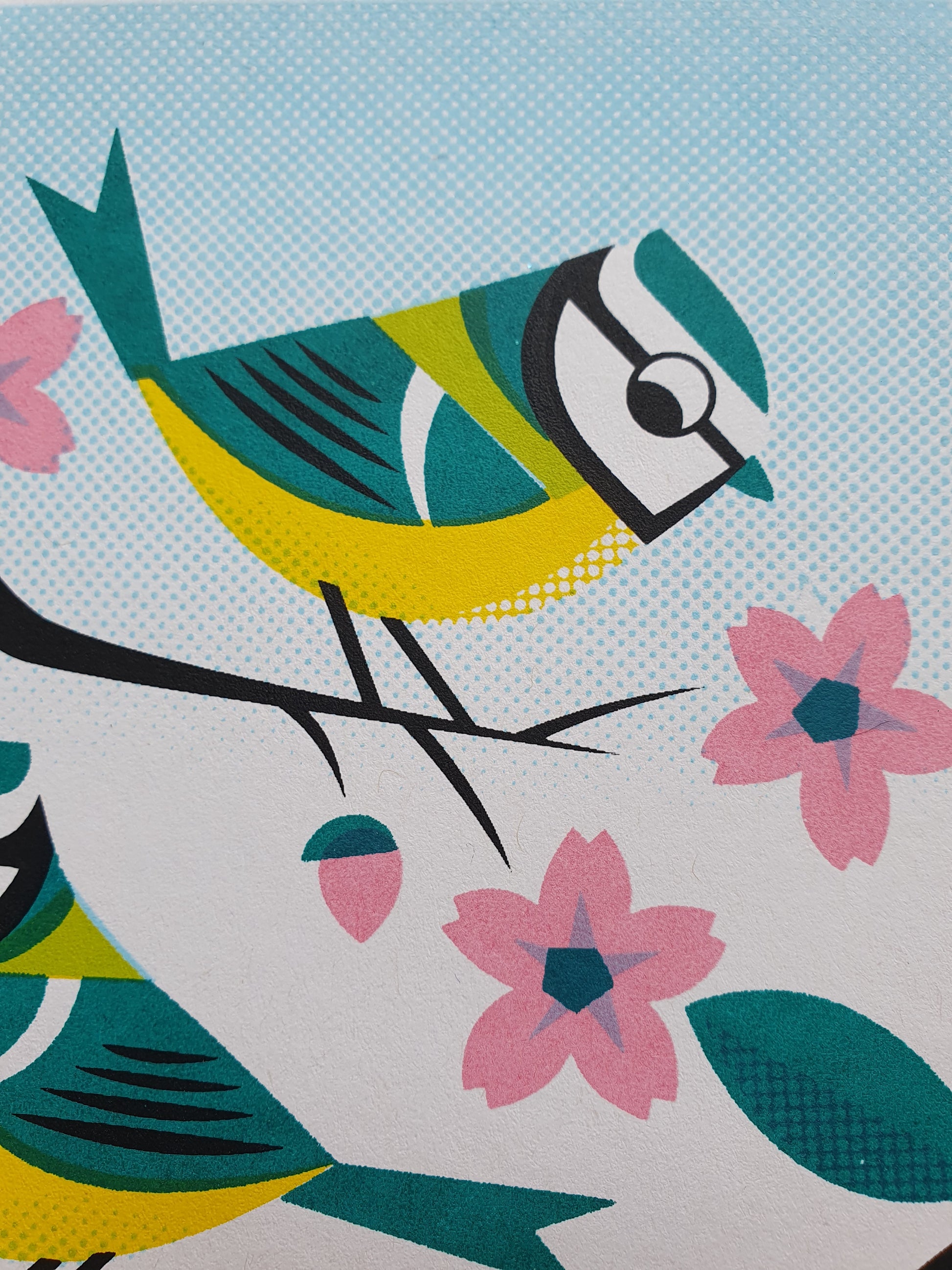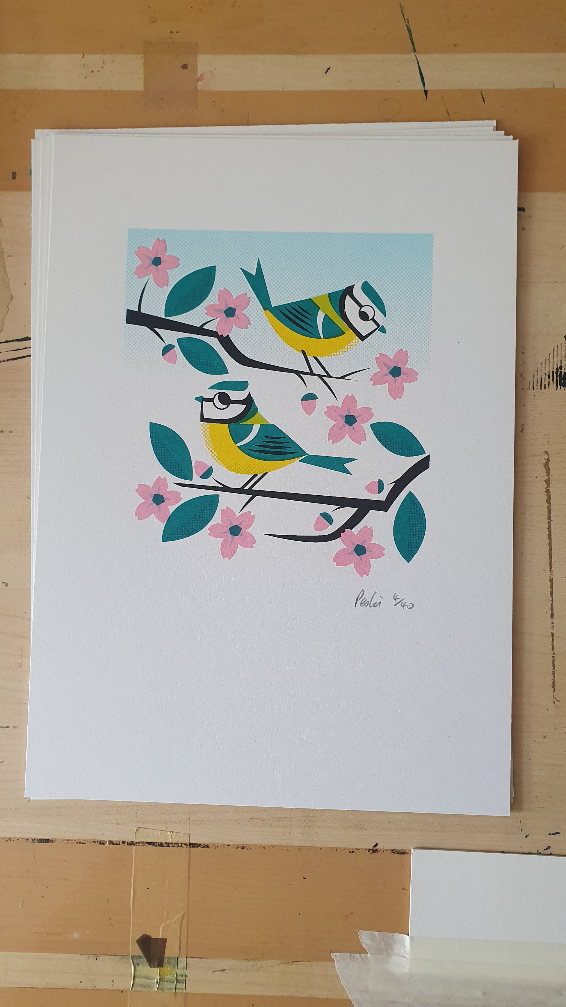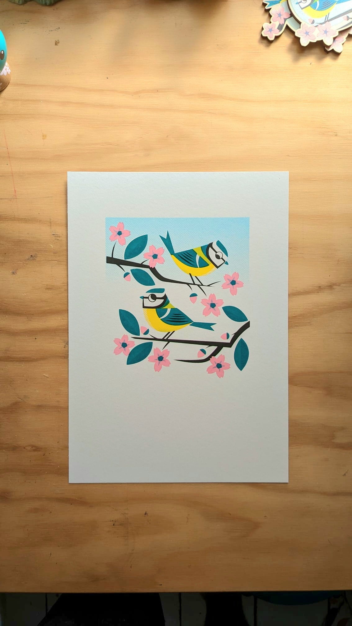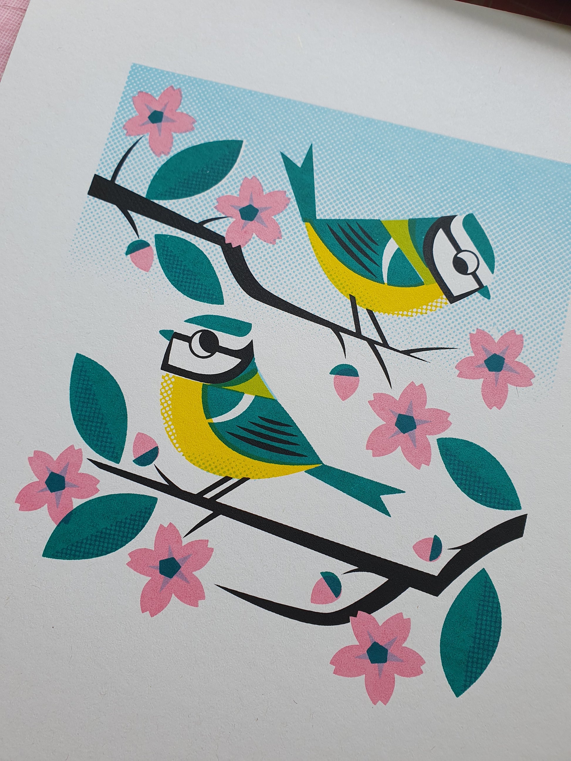 Bluetits - A4 5 colour screenprint - by Peski Studio