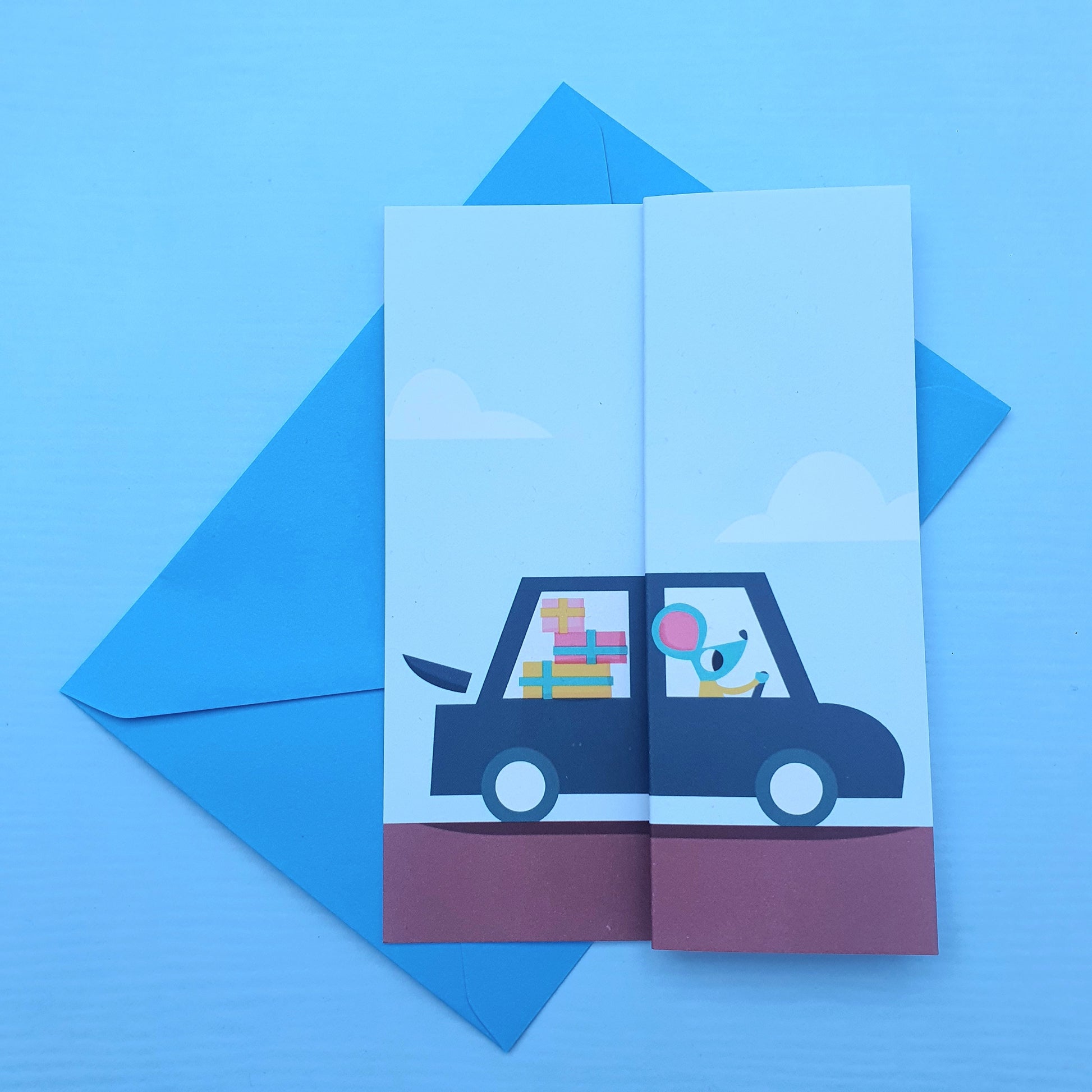 Folds to an A6 card size. Printed on uncoated 350gsm recycled card stock which may have some flecks or speckles in. This design comes with a blue colour envelope.