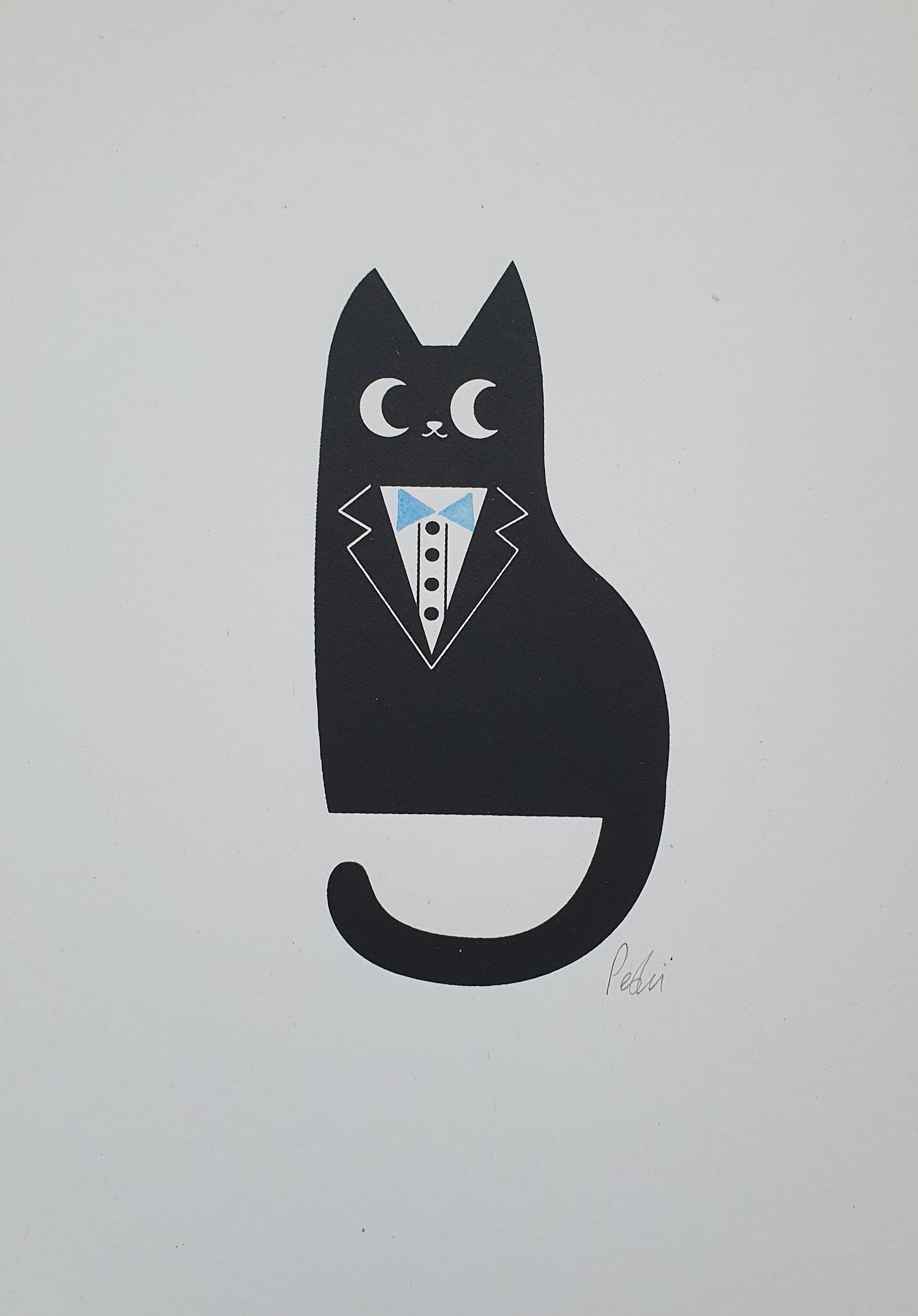 Tuxedo Cat (blue) - A4 screenprint - by Peski Studio
